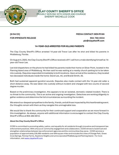 Deputies say Trevor Lee shot his parents to death inside their Middleburg home just after midnight Monday, before walking to a nearby church to call police and tell them what he had done.